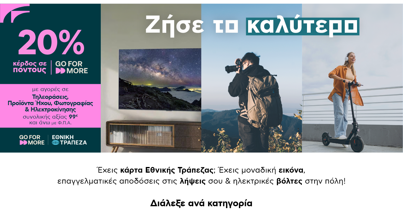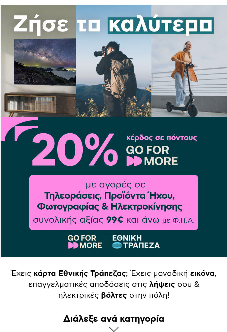 Iσχύει έως 03/05/2026 για αγορές Τηλεοράσεων, Προϊόντων Ήχου, Φωτογραφίας & Ηλεκτροκίνησης συνολικής αξίας 99€ και άνω, με κάρτες Εθνικής Τράπεζας.